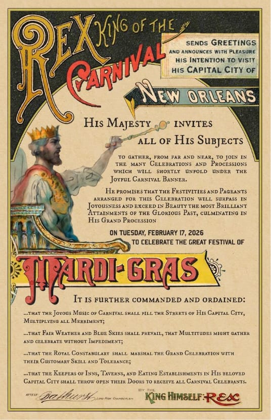 Today, during the traditional Kings’ Day celebration at Mardi Gras World, Rex, the King of Carnival, by royal edict, proclaimed Mardi Gras 2026.