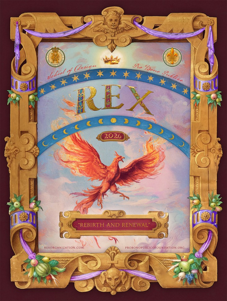 The 2025 Rex proclamation, by New Orleans artist Saskia Ozols was revealed. The 2026 Rex theme of “Rebirth and Renewal” provided an artistic point of departure for both symbolic and technical inspiration. The artist, Saskia Ozols, utilized oil painting and drawing techniques of the 14th through 19th centuries, specifically the Flemish Vanitas paintings of the 17th century, which were images for meditation on life, mortality, vanity, the intellect, and transformation. Each object in the proclamation painting is a piece of history in and of itself, with rich symbolism steeped in meaning to the Rex Organization. Borrowed from private museums and collections, they range from antique Rex memorabilia to Newcomb pottery and contemporary vessels created by local artists.