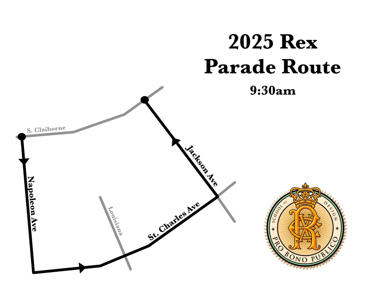 The 2025 Rex Parade will start on Mardi Gras at 9:30 AM at its traditional starting location at Napoleon Avenue and Claiborne Avenue. The parade will follow its traditional route until it reaches Calliope St., where the parade will end.