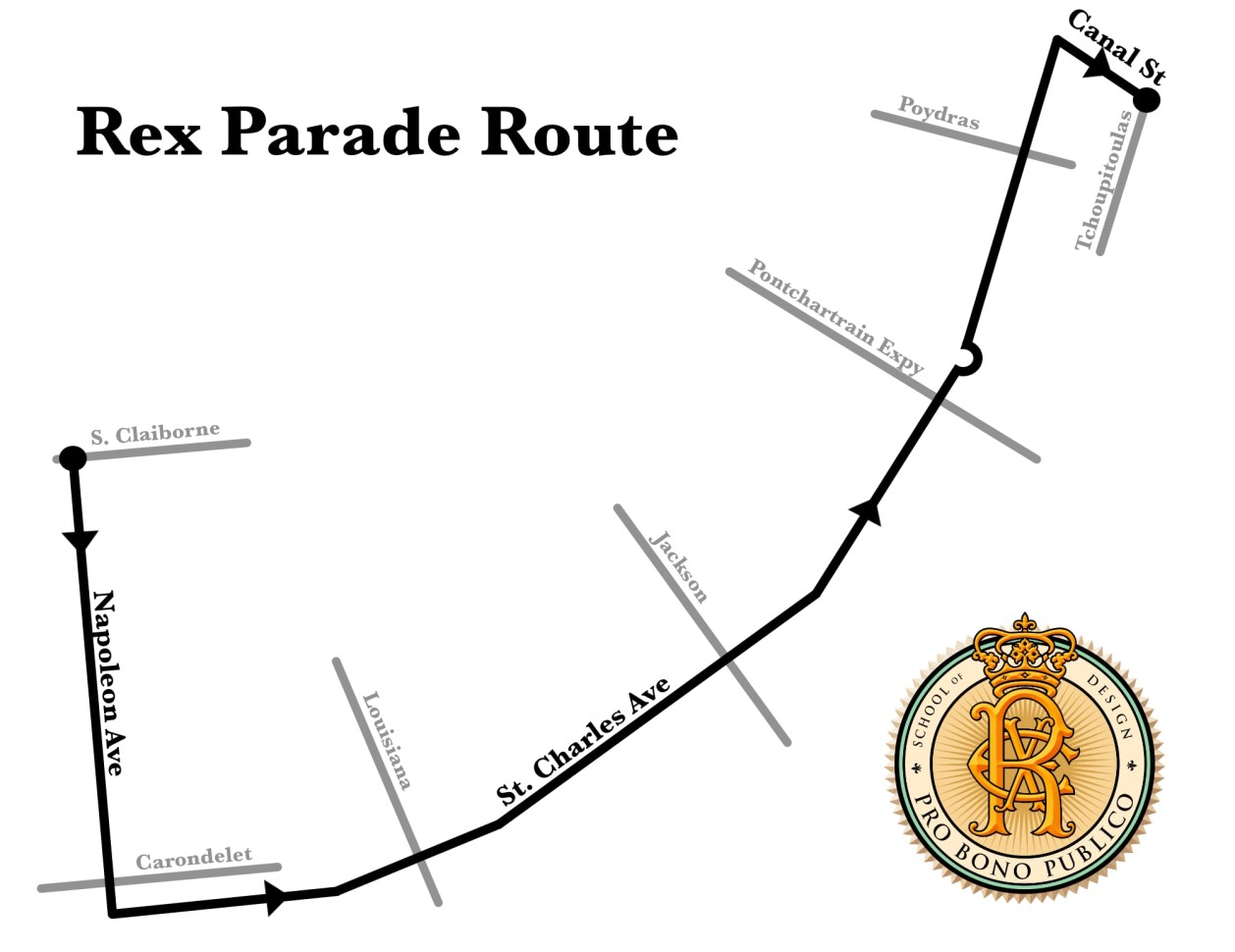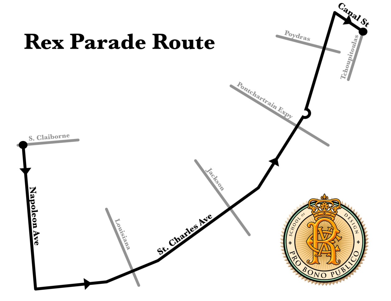 The Rex Parade will roll on its traditional route on Mardi Gras morning at 10:30 am. The route starts river-bound on Napoleon at S. Claiborne. The parade turns towards downtown on St. Charles Ave. Finally it turns towards the river on Canal St. and continues until Tchoupitoulas St.