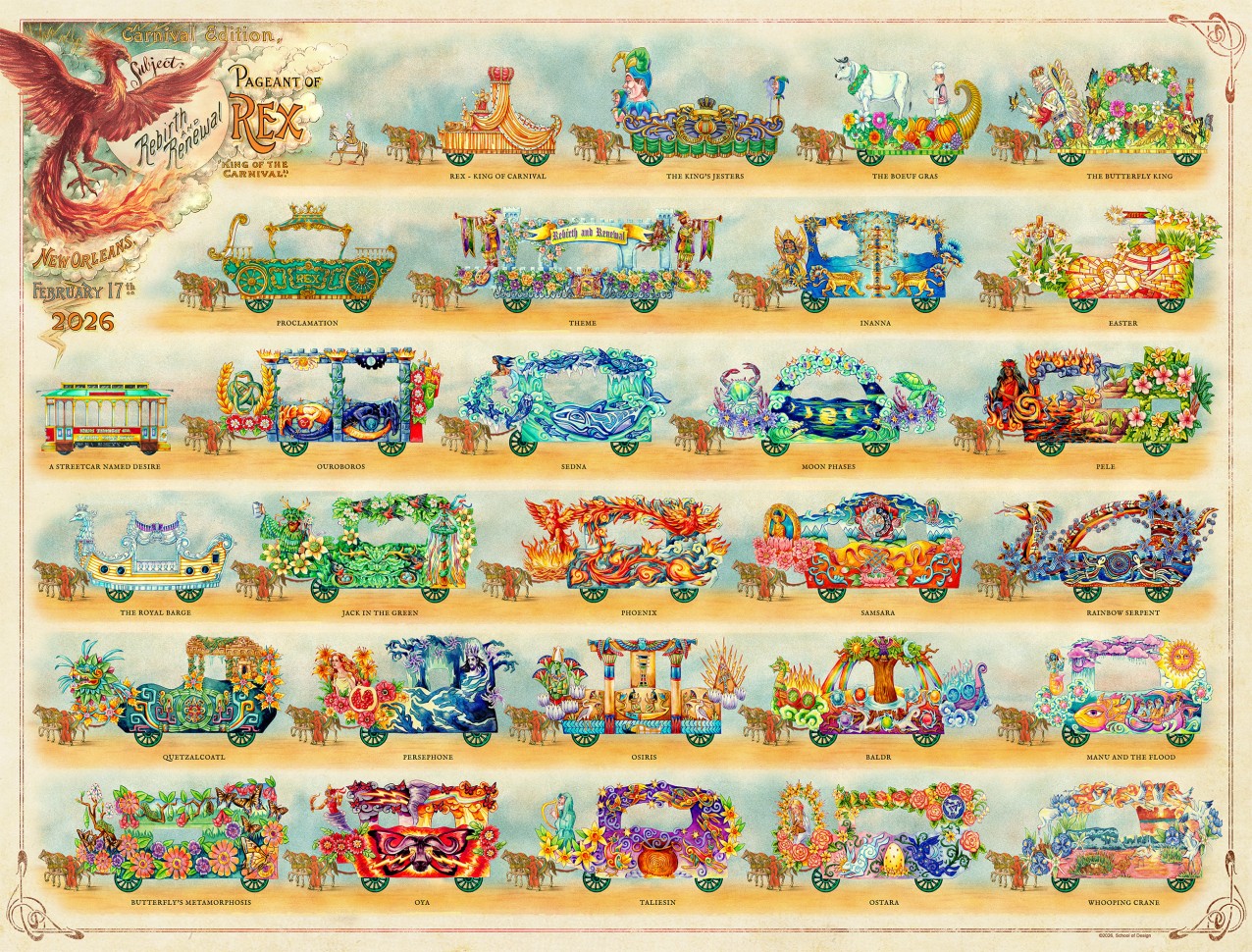 Every culture since neolithic prehistory has told stories of rebirth, renewal, and resurrection – from the great flood myths of almost all known civilizations to the narrative of Christian resurrection central to our own Carnival traditions. The 2026 Rex procession features a beautiful array of symbolically and artistically rich examples of revival stories and legends. From India to the Inuit and from deities to the day-to-day, these artistically striking examples illustrate not only cross-cultural differences, but also the universality of mankind’s hopes for renewal and focus on the eternal.